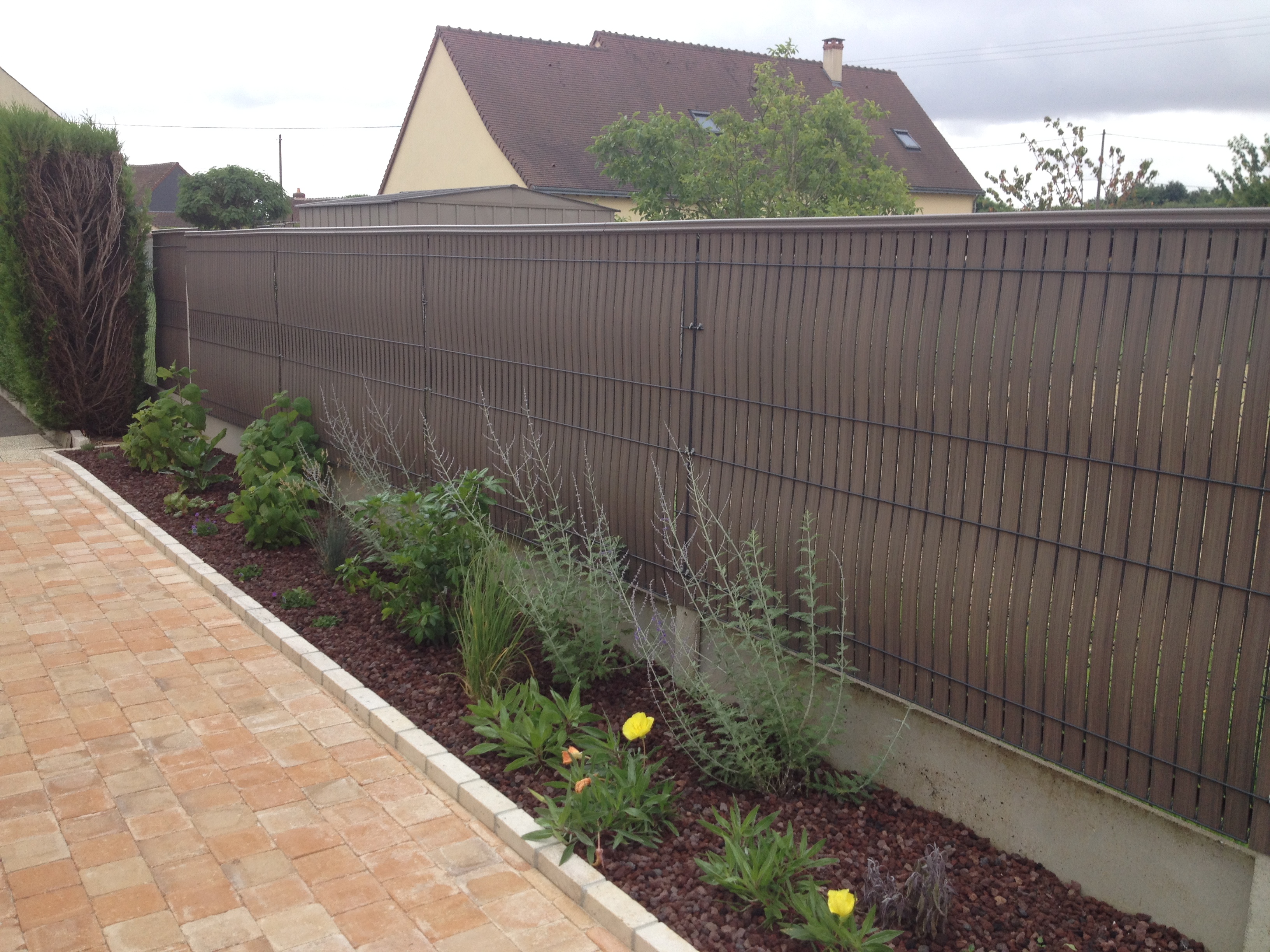 Cet exemple illustre parfaitement la transformation d'une limite de propriété classique en une barrière visuelle élégante et chaleureuse. Ici, la structure est composée de panneaux de treillis soudés robustes, fixés sur un muret technique qui assure la planéité de l'installation. L'ajout de lames d'occultation en composite de couleur marron apporte un aspect naturel proche du bois, sans les contraintes d'entretien.