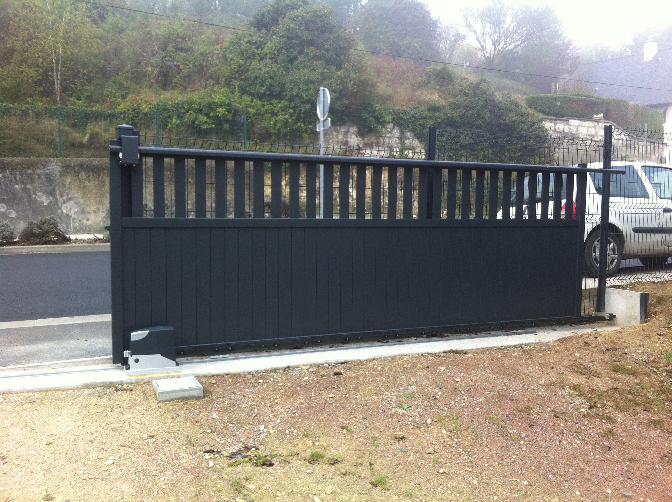 Cet exemple montre une configuration idéale pour la sécurité : un portail en aluminium à remplissage ajouré. La motorisation, ici couplée à un système de visiophone, permet de filtrer les visiteurs sans quitter votre domicile. L'utilisation de l'aluminium assure que le poids reste maîtrisé, permettant une ouverture rapide et silencieuse, parfaitement adaptée à un usage intensif quotidien.