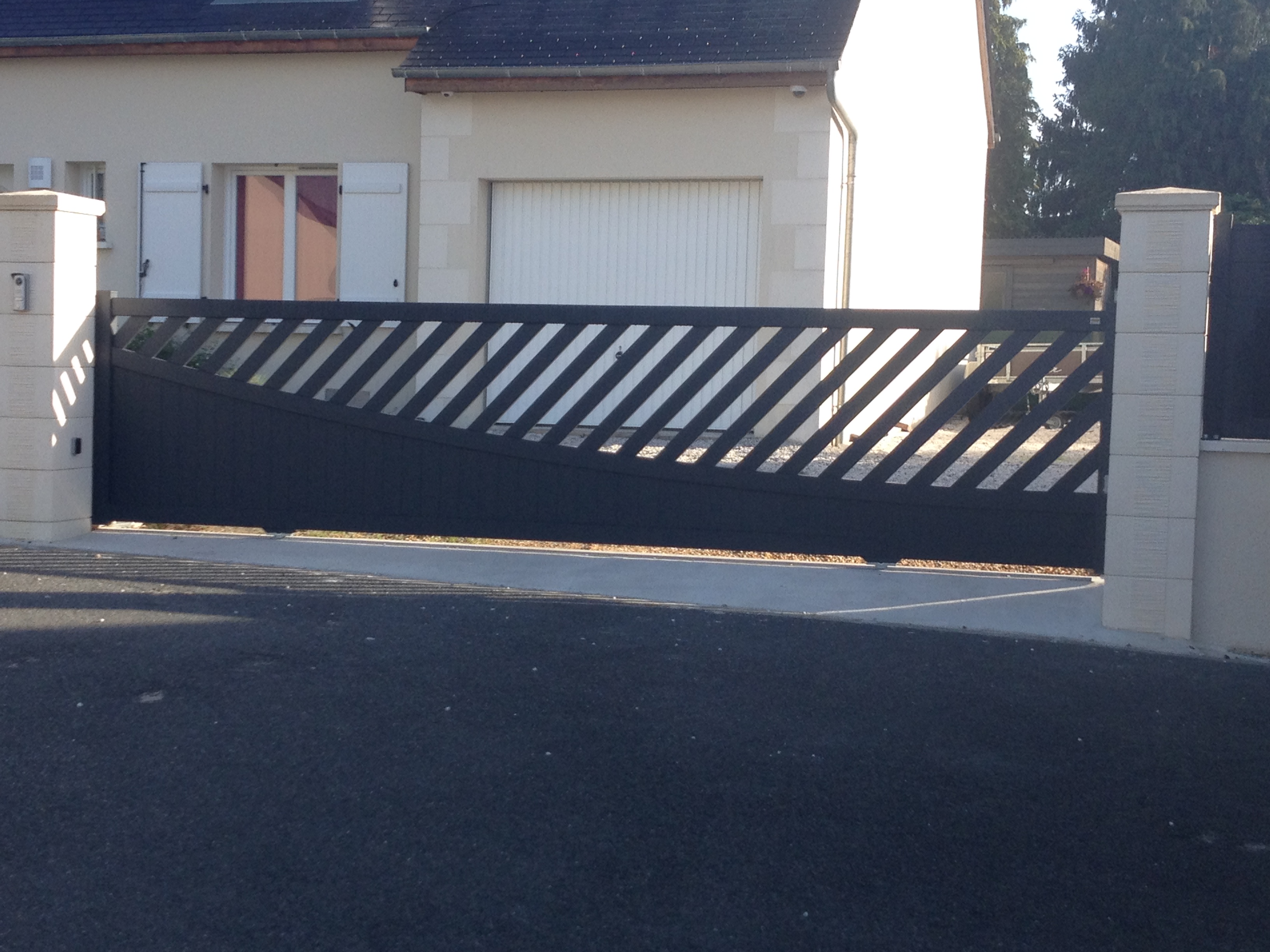 Cet exemple illustre parfaitement comment le sur-mesure peut transformer l'accès à votre propriété en un élément de design fort. Ce modèle se distingue par sa partie supérieure composée de lames obliques ajourées, créant un effet visuel dynamique tout en laissant circuler l'air—un atout majeur pour réduire la prise au vent dans les zones dégagées de Touraine.