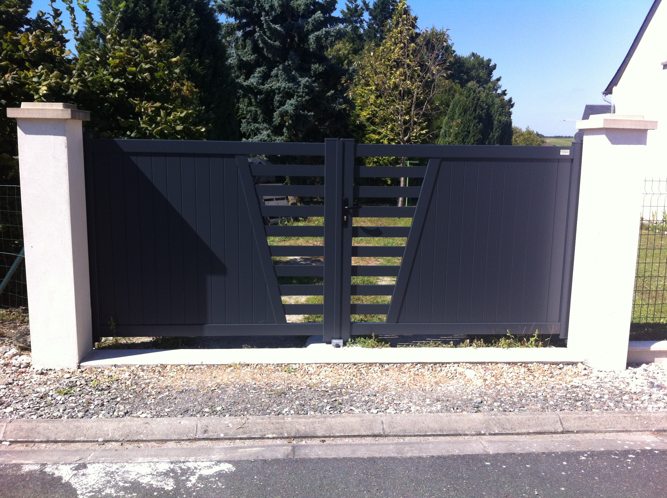 Ce modèle illustre parfaitement la tendance actuelle en Indre-et-Loire pour les entrées de caractère. Ce portail battant en aluminium se distingue par son design asymétrique audacieux : une large partie pleine garantissant une intimité totale, contrastée par une section centrale en forme de trapèze inversé.