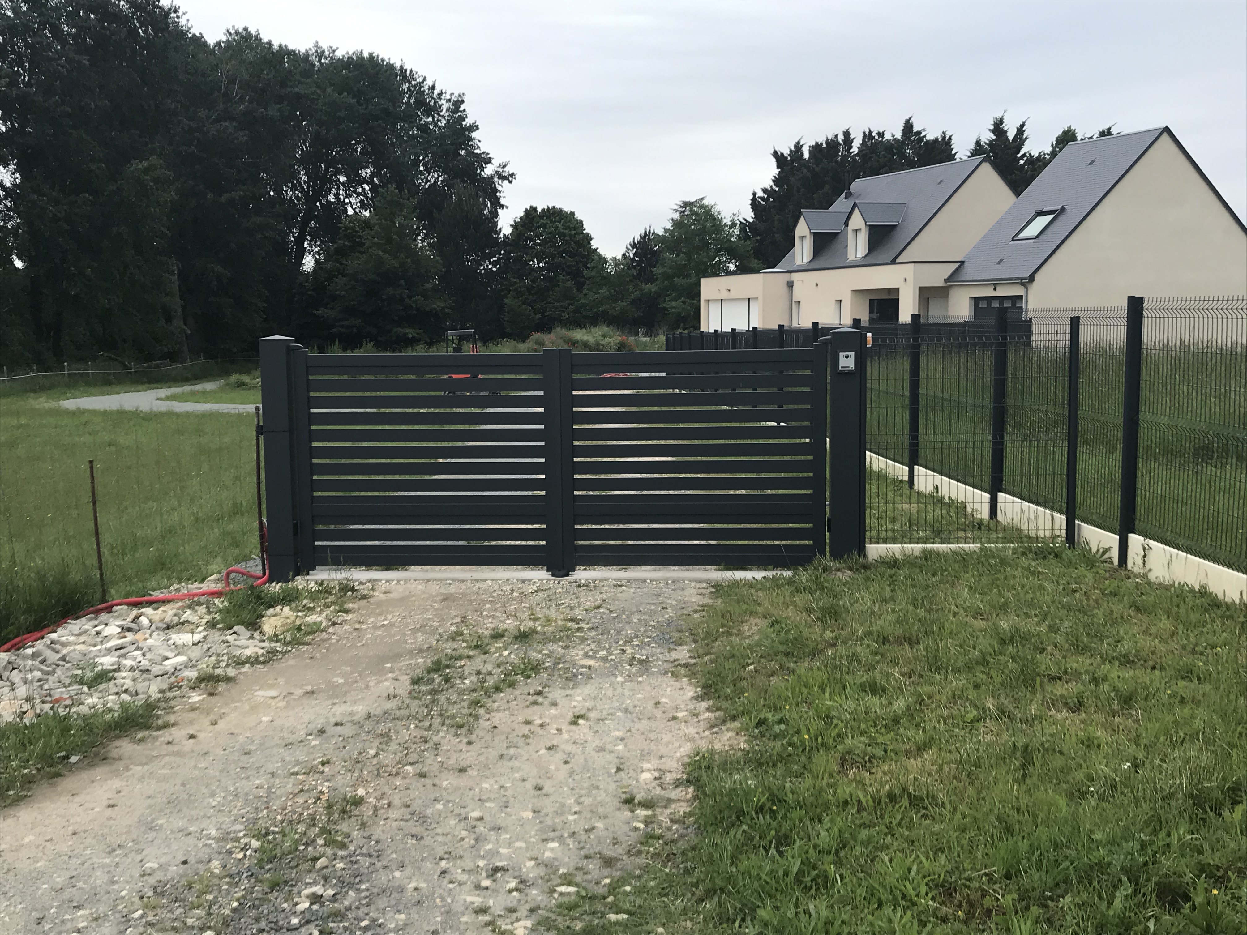 Nous avons récemment installé ce modèle chez un particulier à Saint-Avertin. Ce portail à lames horizontales ajourées offre un rendu très actuel. Les espacements entre les lames permettent de laisser circuler l'air, ce qui est crucial pour les zones exposées au vent, tout en apportant une touche de légèreté visuelle. C’est le compromis parfait pour ceux qui veulent délimiter leur terrain sans créer une paroi totalement opaque.